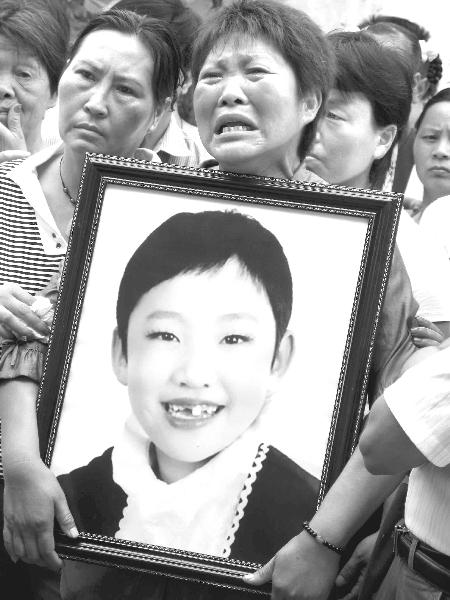 盡管還未開庭,但法庭外已聚集了數(shù)百名群眾,其中,受害人的親屬舉著死者生前的照片聲淚俱下地控訴著殺人兇手,不時有群眾擦拭眼淚!拔沂菍3虖10多里外的常莊鄉(xiāng)趕過來的,我要看看這個殺人女教師究竟長什么樣,要看看她為什么要?dú)⒑ψ约耗陜H8歲的學(xué)生!爆F(xiàn)場一位老太太說。
