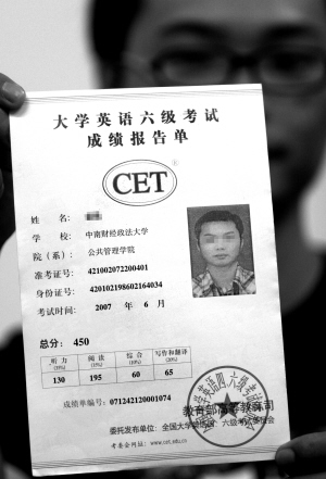 圖為記者花300元辦的六級(jí)假證。 記者苗劍 攝