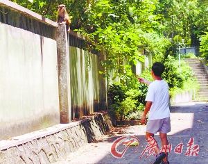 廣東外語外貿(mào)大學(xué)校園東北角是幾棟教工宿舍,隔著圍墻,外面就是郁郁蔥蔥的白云山!按蟾5天前,我看到墻頭上蹲著一只猴子,就回屋拿香蕉過來逗它。它盯著香蕉,又看了我?guī)籽郏罅锵聡鷫μ轿疑磉,用前爪拍拍我的腿?此蓱z,也多少有點害怕,我把香蕉扔給它,它就自己剝開香蕉吃了!弊≡谶@里的鄭叔告訴記者,這是一只成年猴,個子有70厘米左右,樣子很可憐,一點也不兇!拔以谶@里住了三十多年了,還頭一回看到猴子下山!
