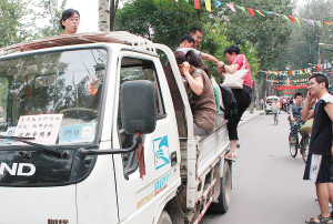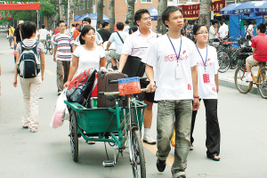 天津大學(xué)“新生報(bào)到處”所在的教學(xué)樓門前,整整齊齊地停著一排面包車、小貨車,每輛車上都貼著“迎接新生專用車”等標(biāo)志。新生登記后,高年級(jí)志愿者就會(huì)幫他們將隨身行李裝上汽車。能容納五六個(gè)人的面包車塞下行李之后,載上新生一家三口,一般就再也擠不下人了。從老師們口中得知,僅僅昨天上午,他們就在兩地往返了二三十次。