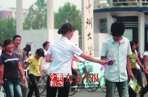 上午11時(shí),發(fā)放點(diǎn)移到中州大學(xué)和鄭州師專門口,正在報(bào)名的學(xué)生和家長(zhǎng)明顯增多,看到計(jì)生人員發(fā)宣傳資料,很多學(xué)生主動(dòng)圍了上來。