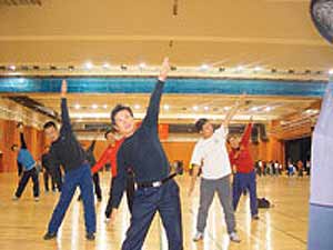 記者昨天在培訓(xùn)現(xiàn)場發(fā)現(xiàn),西城區(qū)中小學(xué)體育教師幾乎悉數(shù)到齊,一些老師趁休息空當(dāng)在琢磨動(dòng)作。很快,一些上年紀(jì)的老師就已汗流浹背。西城區(qū)教委體育科胡惠霞科長介紹說,此次培訓(xùn)要求中小學(xué)體育老師學(xué)會(huì)各自需要推廣的兩套操,培訓(xùn)結(jié)束回校后須在一周之內(nèi)完全熟練,然后向?qū)W生推廣。預(yù)計(jì)下月該區(qū)中小學(xué)生可以正式做起第三套廣播體操。胡科長表示,此次培訓(xùn)嚴(yán)把教師關(guān),新廣播體操的熟練程度計(jì)為教師基本功的一個(gè)部分,并納入體育老師的考核內(nèi)容,只有培訓(xùn)合格的體育老師才能上崗。