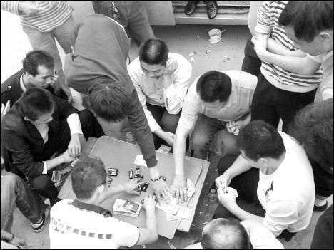 湖北第二師范學(xué)院門口,許多人擺攤子玩牌九。記者施政 攝