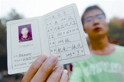 小吳的學(xué)生證上清楚地顯示出他的入學(xué)時間。記者 熊波 攝