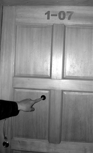 學(xué)生們還在上課,女生公寓空無一人,只有生活老師在里面守候,“鐵將軍”把住女生公寓的大門,生活老師打開大門后,記者進(jìn)入了女生公寓。女生公寓有7層樓高,過道兩旁對應(yīng)著一間間女生寢室。每間寢室的房門上,果然就有一個圓形小孔。這小孔直徑只有四五厘米,記者將眼睛貼近小孔朝里面一望,寢室里一覽無余。