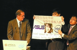 昨日(10月29日,下同),英特爾(Intel)總裁兼CEO歐德寧在北大演講時(shí),華碩天價(jià)索賠案主角之一周成宇忽然沖上臺(tái),舉牌抗議英特爾與華碩聯(lián)合陷害黃靜,隨后被保安架離會(huì)場(chǎng)。周成宇事后稱(chēng),此舉是“為黃靜討個(gè)公道”。