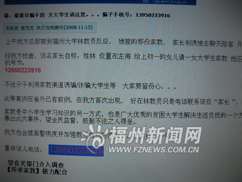 吳同學(xué)將情況反映給師大傳承家教中心。15日傍晚,在福州便民論壇,一則標(biāo)題加亮的帖子《最新詐騙手段,女大學(xué)生請(qǐng)注意,騙子手機(jī)號(hào)……》發(fā)布。帖子寫著:“上午我方接到福州大學(xué)教員反映,她接的家教,家長利誘她去聊天陪客,月薪上千。經(jīng)核查,該家長自稱姓林,家住左海附近,給上初一的女兒請(qǐng)一名女大學(xué)生當(dāng)家教。他還特意強(qiáng)調(diào)要家庭貧困的女大學(xué)生,該家長手機(jī)號(hào)為139xxxxxxx6”。該帖子也寫明了他們之所以曝光該家長手機(jī)號(hào)碼的原因:“我們不想讓女生被不法之徒玷污!