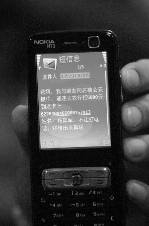 陳女士昨天對(duì)記者說(shuō),11月29日凌晨4時(shí)38分,她收到一條短信,上面寫著:“爸媽,我與朋友同居被公安抓住,請(qǐng)速去農(nóng)行打5800元到這卡上6228480461008157913,姓名:楊國(guó)軍,不讓打電話,詳情出來(lái)再說(shuō)!倍l(fā)送人竟然是一個(gè)陌生人的號(hào)碼:13529330385。陳女士告訴記者,她女兒阿燕(化名)在肇慶某職業(yè)技術(shù)學(xué)院讀大一,由于之前已提前向她提醒說(shuō)至少有四五名學(xué)生的家長(zhǎng)都收到了這條短信,因此她并沒(méi)有再理會(huì)。