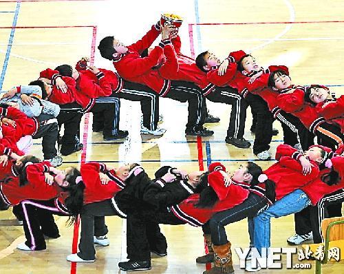 不用任何支撐,20名學(xué)生依次躺在同伴腿上疊成一個圈,雙手傳遞裝著乒乓球的小桶,6分鐘內(nèi)比賽哪個隊傳遞得最快。這是“歡樂不倒翁”項目比賽時的場景,不僅比拼個人的平衡能力,還要求孩子和前后兩個伙伴都默契配合。