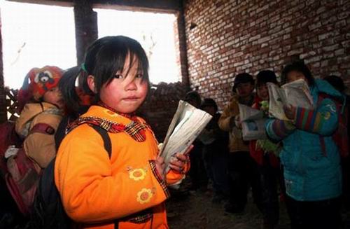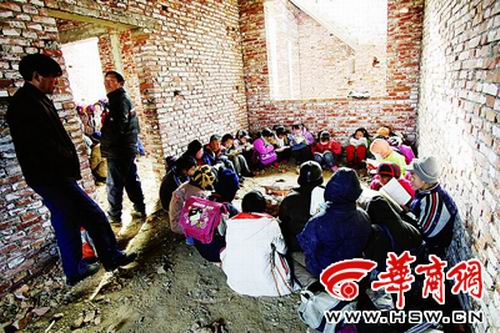 上午10時(shí)許,距董廟小學(xué)200米的地方傳來(lái)讀書(shū)聲。這是剛砌好不久的磚房,沒(méi)窗也沒(méi)門(mén),學(xué)生分別待在幾個(gè)房間里,四下漏風(fēng),穿棉襖還是冷,大家圍成圈不停地跺著腳。老師用磚搭個(gè)簡(jiǎn)易爐,燒些樹(shù)枝讓大家能感覺(jué)點(diǎn)暖意。“這種地方的確不能上課,總不能耽誤學(xué)業(yè),只好先找個(gè)地方解決了。”老師說(shuō)。
