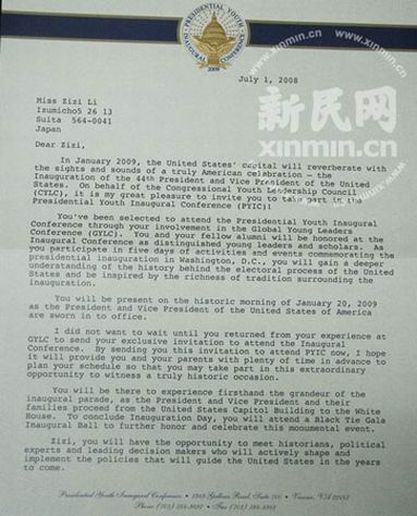 新民網(wǎng)29日致電該女生所在的成都市實(shí)驗(yàn)外國語學(xué)校,分管德育工作的副校長李俊說,該校高一女生李紫子獲邀參加奧巴馬就職典禮確有其事,但發(fā)出邀請函的單位并不是美國國會,而是國會下屬的一個(gè)名為“全球青少年領(lǐng)袖論壇”(the Congressional Youth Leadership Council)的青少年組織。去年8月,李紫子因參加了該組織舉辦的比賽并表現(xiàn)出色,因此才會收到邀請函。