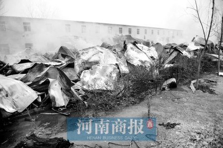 一棟兩層板房宿舍被燒成廢墟