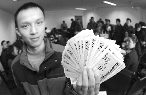 記者在現(xiàn)場注意到,部分學(xué)生代表拿到同學(xué)們預(yù)訂的火車票后仍愁眉不展。環(huán)境學(xué)院07級(jí)碩士研究生石昕就拿著一疊票在登記表上核對(duì)、打鉤,不時(shí)嘆息。他們班26人訂票,只拿到了14張票,其余都沒有!安皇菦]票,是有票他們不要!笔空f,沒訂到票的同學(xué)多半是往重慶、哈爾濱等方向的,都是要求太高,指定要硬臥,坐票都不考慮。這讓火車站工作人員為了難,這些地區(qū)火車票本身就很緊,臥鋪票更加有限,非臥鋪不要的要求根本無法滿足。