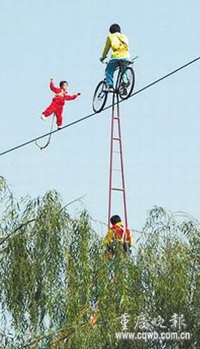 據(jù)了解,學(xué)走鋼絲的第一步是從單腳站磚頭開始,逐漸增加高度和難度。經(jīng)過這種循序漸進(jìn)的訓(xùn)練,張婭很快掌握了低空走鋼絲技巧。經(jīng)指導(dǎo),她又學(xué)會(huì)在鋼絲上表演“金雞獨(dú)立”、“旋轉(zhuǎn)”、“平臥”等高難度動(dòng)作。通常,走鋼絲表演者手里要拿東西保持平衡,可張婭學(xué)藝一年左右,就能做到空手走鋼絲,還能突然躺在鋼絲上“睡覺”和“起床”。