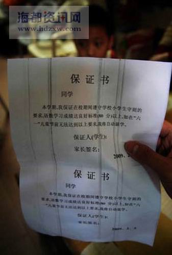 昨日下午5時,記者在石獅市區(qū)找到小強的家人,小強的爸爸王先生(化名)告訴記者,小強今年11歲,在石獅塔前小學四年級1班就讀。說著,王先生拿出校方的保證書,上面寫著“本學期,我保證在校期間遵守學校小學生守則的要求,語數(shù)學習成績達良好標準(80分)以上,如在六一兒童節(jié)前無法達到以上要求,我將自動退學”,后面還有保證人(學生)和家長簽名,時間為2月5日,但沒落款。
