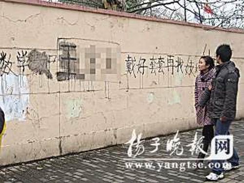 昨天是新學(xué)期的第一天。然而,離南京市第十二中學(xué)不到300米的一處圍墻上被人用墨水書寫惡毒的話語,辱罵該校一名即將退休的數(shù)學(xué)老師,言語不堪入目。該校校長得知消息后,立即帶人用石灰膏涂去了學(xué)校名字和老師的名字,然后報了警。目前,警方已經(jīng)介入調(diào)查。