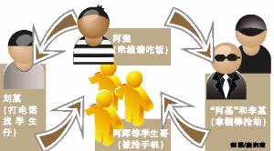 據(jù)嫌疑人交代,3月8日,一個(gè)花名叫“阿基”的男子找到阿強(qiáng),讓阿強(qiáng)想辦法找?guī)讉(gè)學(xué)生出來,伺機(jī)搶劫他們的財(cái)物。阿強(qiáng)因最近手中缺錢,就一口應(yīng)承下來,并找到平時(shí)在外面玩時(shí)認(rèn)識(shí)的19歲的廣西人劉某,以請(qǐng)吃飯為名讓劉某帶些“學(xué)生仔”出來。