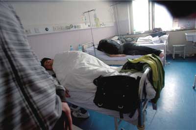 昨天下午1點(diǎn),在北京市第六醫(yī)院南樓住院部4層,中央戲劇學(xué)院的患者分散在3個(gè)病房,有近20人。他們打著點(diǎn)滴,躺在病床上,有同學(xué)看護(hù),學(xué)校老師也不斷查看。醫(yī)院西樓還有部分中戲患者,3人在重癥監(jiān)護(hù)室。一患病男生說,他事發(fā)前一天曾吃過學(xué)校食堂的三明治。另據(jù)前來探病的女同學(xué)說:“幾乎吃了三明治的同學(xué)都被送到了醫(yī)院診治!
