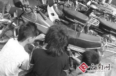 在距離勁的家大約500米的一家臨街的摩托車修理店,記者見到了這兩個(gè)孩子,兩人都一頭動(dòng)漫長發(fā),似曾染色,滿身滿手都是修車的黑色油污。