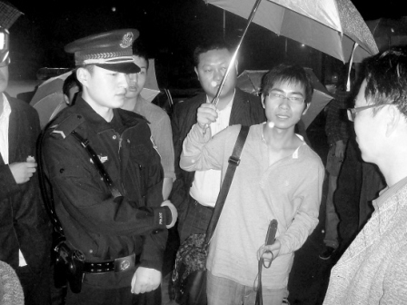 “下午2點(diǎn)20分左右,距比賽開始僅僅剩下40分鐘了,賽場內(nèi)前奏的音樂已經(jīng)響起,這時(shí)‘米黃外套’回來終于告訴大家,由于此次用的是賽車場發(fā)給上海市中學(xué)生的團(tuán)體票,大學(xué)生不能入場,所以今天可能‘沒戲了’。此時(shí)九陽旅行社的洪經(jīng)理看起來也焦頭爛額,他沒有打傘,站在大雨里,水珠不斷順著頭發(fā)流下!