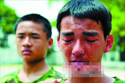 王博15歲,爸爸是政府官員,媽媽供職于銀行系統(tǒng),他因上網(wǎng)成癮、離家出走和早戀,今年1月19日被父母送入啟德學(xué)校至今。他告訴記者,剛進(jìn)來的時(shí)候很害怕,像進(jìn)了勞教所一樣。他在禁閉室挨打了,那是因?yàn)?“站久了,瞌睡,一栽一栽的,牙齒磕住嘴唇都磕破了,后來,瞌睡得支撐不住了,站也站不穩(wěn),頭撞在了墻上,教官發(fā)現(xiàn)后,就用教鞭打我手掌;在背《啟德學(xué)校學(xué)員守則》時(shí),背漏一個(gè)字,也要挨打,還好,我半個(gè)小時(shí)就背會(huì),順利過關(guān)。 ”