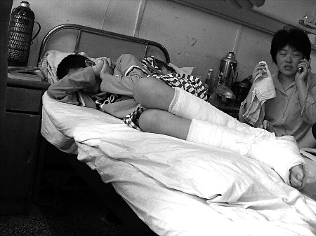 病床上的小峰臉上稚氣未脫,神情輕松,而莊女士則一臉的憂愁。一個多月連續(xù)陪床使她看起來非常疲憊。