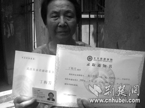 昨日(8月5日,下同)上午,家住漢口永清街趙家條的丁梅芳老太向記者展示了這封標(biāo)稱“北大資源學(xué)院(以下簡稱北資院)”,在8月3日寄達(dá)的錄取通知書。記者看到,該錄取通知書上寫著:“丁梅芳同學(xué),我校決定錄取你入數(shù)字傳媒學(xué)院系新聞傳播(本)專業(yè)學(xué)習(xí),請持本通知書于2008年8月25日……到校報到!