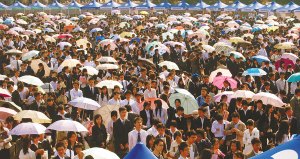 有了前兩天的經(jīng)驗(yàn),許多女生帶了拖鞋和折疊凳來(它們和遮陽傘一起被稱為“求職三寶”),管它和筆挺的西裝配不配。等到快到自己了,再換上高跟鞋,又是漂亮的“準(zhǔn)白領(lǐng)麗人”。夏楊、陳輝、余蓉蓉、方瑋