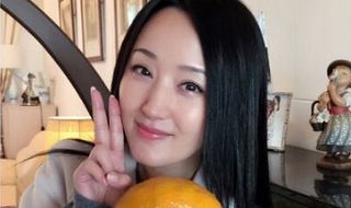 楊鈺瑩手拿大橘子比剪刀手