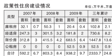 在住房保障方面,自2007年至2009年,本市已累計(jì)建設(shè)了24.8萬(wàn)套政策性住房。其中限價(jià)房套數(shù)最多,達(dá)到13.6萬(wàn)套。