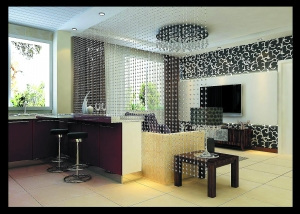 此方案為一居室戶型,該戶型的居住人群多為年輕人,因此方案為現(xiàn)代簡約風(fēng)格。將廚房完全敞開,與客廳連在一起,采用島臺的餐桌既節(jié)省空間,又時尚大方,使用水晶簾將沙發(fā)與廚房隔開,具有通透性。在顏色上采用米黃色的墻面,與黑白搭配的壁紙和紅色烤漆櫥柜結(jié)合,時尚感極強(qiáng)。(盧柳兆)