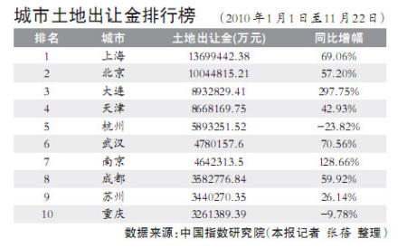 今年雖然遭遇史上最嚴(yán)厲的房地產(chǎn)調(diào)控,但各大城市的土地出讓金卻出現(xiàn)大幅提升。中國指數(shù)研究院的數(shù)據(jù)顯示,截至11月22日,上海土地出讓收入以1369.94億元高居榜首,北京以1004.48億元位列第二,大連以893.28億元位居第三,去年排在第一位的杭州今年跌出前三,僅收入589.33億元(詳見附表)。值得注意的是,十大城市中,只有杭州和重慶的土地出讓金出現(xiàn)了同比下降的現(xiàn)象,其余城市的出讓金則大幅增加,增幅最大的是大連,比去年同期增長了297.75%,增幅最小的蘇州也達(dá)到了26.14%。