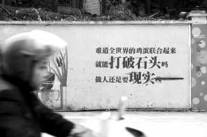 日前,讀者吳先生打進(jìn)本報(bào)熱線稱,他在南岸一新建小區(qū)外看到了這樣一條標(biāo)語,讓他很費(fèi)解,他不知道開發(fā)商打出這條廣告宣傳語是什么意思?吳先生說,這句宣傳語這樣寫道:“難道全世界的雞蛋聯(lián)合起來,就能打破石頭嗎?做人還是要現(xiàn)實(shí)些!