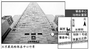 位于東三環(huán)國貿橋的西南角,矗立在長安街的南邊,主樓高達249.9米。中國指數(shù)研究院的調查表明,銀泰中心是目前北京在售總高度最高的樓盤。