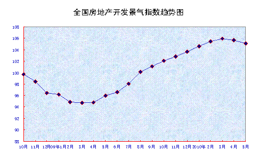 中新網(wǎng)6月10日電 據(jù)國(guó)家統(tǒng)計(jì)局網(wǎng)站消息,5月份,全國(guó)房地產(chǎn)開(kāi)發(fā)景氣指數(shù)(簡(jiǎn)稱“國(guó)房景氣指數(shù)”)為105.07,比4月份回落0.59點(diǎn),比去年同期提高9.13點(diǎn)。