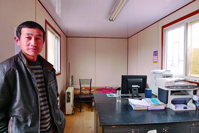 “你看到的只是外面,里面更好!痹摴さ匾晃恍振T的負(fù)責(zé)人自豪地說。果然如馮先生所言,房間內(nèi)部別有洞天。四周墻壁不但加裝了保溫層,還進(jìn)行了裝飾。上有吊頂?shù)鯚簦落亸?fù)合木地板,窗戶上包了窗套,墻上安了插座和電箱,空氣開關(guān)的電閘有模有樣,桌上還放著電腦和打印機(jī)等辦公設(shè)備。“怎么樣?還不錯吧?在工地上住這樣的房子算是一種奢侈了。這些電源插座都不是擺設(shè),用暖氣和空調(diào)都沒問題!瘪T先生介紹說。