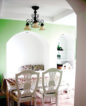 就餐環(huán)境的色彩配置對家人的就餐心理影響很大。孫女士在裝飾餐廳時,選擇淺綠色為主色調,搭配上白色餐桌椅。明朗輕快的色調不但能增進就餐者的興致,刺激食欲,而且能營造一種溫馨、甜蜜的氛圍(如圖②)。