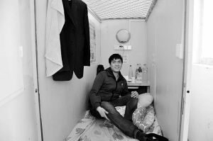 黃日新的膠囊公寓位于六郎莊一幢三層灰色民居的頂層。來到“膠囊公寓”門口,眼前一間10平方米左右的小屋里并排立著2個類似儲藏室、通體白色的隔間。每個隔間大約占地2平方米,高約2米、長2.4米、寬0.72米!斑@床就連姚明也可以睡,他可以從門這邊開始睡,就把腳伸到電腦桌里面去了!秉S日新說。記者看到,隔間外安著雙鎖防盜門,門內(nèi)無縫隙地鋪著張窄長的木板床,床下很空,可以放行李和雜物。床的盡頭有張電腦桌,墻上有盞圓形壁燈,壁燈下面有寬帶接口、有線電視接口和兩組電源插座!澳z囊”的上方由鐵網(wǎng)焊接而成,這不僅使得屋頂?shù)臒艄饪梢酝高^網(wǎng)子保證隔間內(nèi)的采光,還可以充分利用房子的暖氣、空調(diào)。拍拍“膠囊”的墻板,有些薄,隔音效果也不太好。黃日新解釋說,許多隔音材料的防火性能不好,可防火才是第一位的,于是,他舍棄了隔音。而考慮通風(fēng),所以也沒有封頂。“但為了保護個人隱私,我在頂部安了兩根鋼筋桿,可以掛衣服,也可以掛‘頂簾’,拉上后就是個封閉空間!