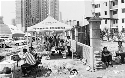近日,在剛剛收房不久的常營兩限房富力陽光花園小區(qū)門口,數十家裝修公司聚集在路邊,搭起帳篷“門臉房”做生意。