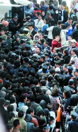 昨日中午,千余人排起“U”形隊(duì)伍,警察在現(xiàn)場(chǎng)維持秩序。隊(duì)伍當(dāng)中,一些小商販在兜售小凳子,還有送外賣(mài)的人圍著人群轉(zhuǎn)了幾圈,不知從哪能擠進(jìn)去。一位現(xiàn)場(chǎng)保安稱(chēng),臨時(shí)用透明膠帶代替警戒線(xiàn),以免發(fā)生踩踏。