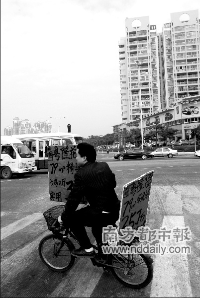 他不是收購廢舊家電,而是推銷房子。昨天中午,在珠海香洲區(qū)梅花路三叉路口附近,出現(xiàn)了一個(gè)特別的房屋經(jīng)紀(jì)人:穿西裝,沒打領(lǐng)帶,騎一輛半舊女式自行車,車前后各固定一塊大紅紙板,寫著他認(rèn)為“最吸引”的二手房源信息。