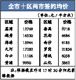 截至昨日17時30分,陽光家緣數(shù)據(jù)顯示,廣州十區(qū)兩市一手住宅簽約均價首度“破萬”,達10550元/平方米,十區(qū)簽約均價11971元/平方米,兩者均比9月漲6%,其中蘿崗區(qū)簽約均價達到前所未有的21836元/平方米,全市稱冠。