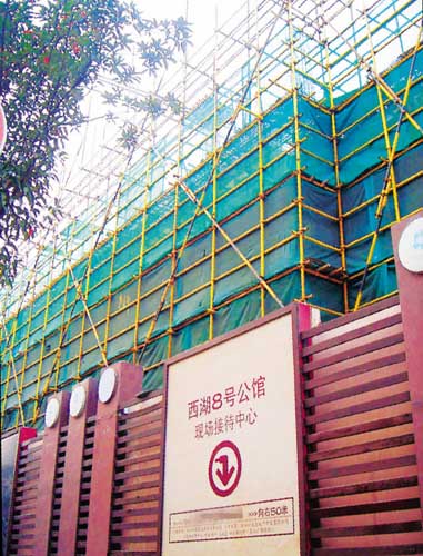 在吳山廣場(chǎng)邊上的四宜路上,記者找到了這個(gè)占地僅5980平方米的樓盤(pán)。因?yàn)榕R近西湖,有限高規(guī)定,所以在一片二手房簇?fù)碇械奈骱?號(hào)公館并不是那么顯眼。整個(gè)樓盤(pán)僅有兩幢房子,而且中間還隔著一幢破舊的樓房,看起來(lái),樓盤(pán)的小景觀并不是特別理想。