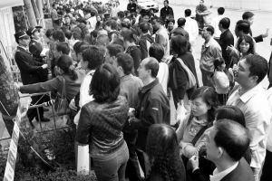 記者在銷售部看到,現(xiàn)場(chǎng)電子屏幕顯示,156套房子在不到兩個(gè)小時(shí)的時(shí)間已全部售光。但是仍然有很多的購(gòu)樓者等在銷售大廳門外,希望能夠有一些購(gòu)樓者放棄自己已購(gòu)買的單位。