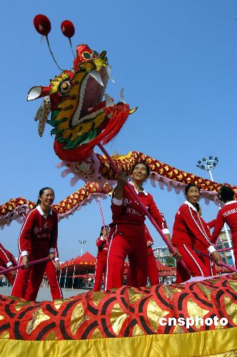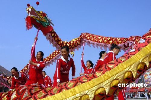 2007年10月20日,在安徽省亳州市萬福廣場,一支女子舞龍隊的隊員正在進行舞龍表演,為在這里舉行的為期兩天的亳州市首屆“萬!崩先斯(jié)助興。中新社發(fā) 張延林 攝