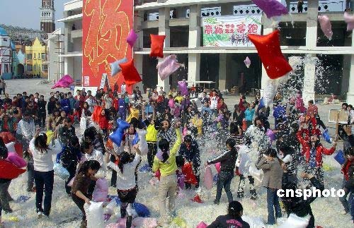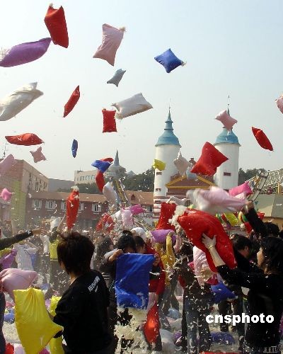 為慶祝即將到來的“三八”國際婦女節(jié),風(fēng)靡歐美的游戲“枕頭大戰(zhàn)”3月3日在長(zhǎng)沙世界之窗再次擂響戰(zhàn)鼓,千余名女性以枕頭當(dāng)“武器”,互相投擲,發(fā)泄壓力。中新社發(fā) 肖前輝 攝