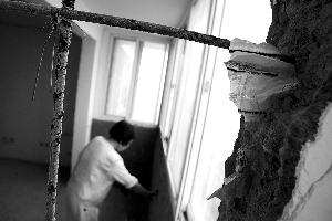 瑞旗家園兩業(yè)主裝修時,發(fā)現(xiàn)兩家陽臺之間的墻壁酥脆,碎墻塊用手一捏便成散沙狀(本報昨日報道)。昨日上午,昌平區(qū)建委兩名工作人員,與開發(fā)商工作人員到業(yè)主徐先生家中鑒定酥脆墻壁,建委人員對著陽臺墻壁踢了幾下,墻上的土便“嘩嘩”往下掉,該人員邊踢邊說,“這樣不行,不過關(guān)。”另一建委工作人員搖了搖露出的鋼筋,發(fā)現(xiàn)鋼筋與主體墻壁和天花板都沒勾連上,證實存在質(zhì)量問題。
