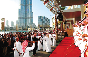 塔旁的迪拜噴泉以275米的破紀(jì)錄水柱吸引世人目光。啟用典禮整個(gè)過程由當(dāng)?shù)孛襟w作全球高清直播,有400多家全球媒體參與報(bào)道,全球20億觀眾收看。