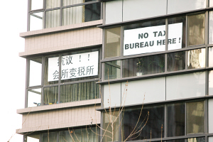 半年來,得知地區(qū)稅務(wù)所即將進(jìn)駐小區(qū)會(huì)所后,朝陽區(qū)金地國際花園的業(yè)主多次向開發(fā)商、CBD管委會(huì)反映情況,但收效甚微。部分業(yè)主在自家窗上貼上標(biāo)語以示抗議。