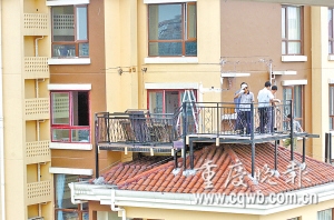 小區(qū)物管公司技術(shù)部人員也在現(xiàn)場幫忙,他們說,由于“吊腳樓”地處32樓高空,又懸在一尖角屋頂上,拆除起來難度較大,“預(yù)計(jì)還要一天才能拆完!
